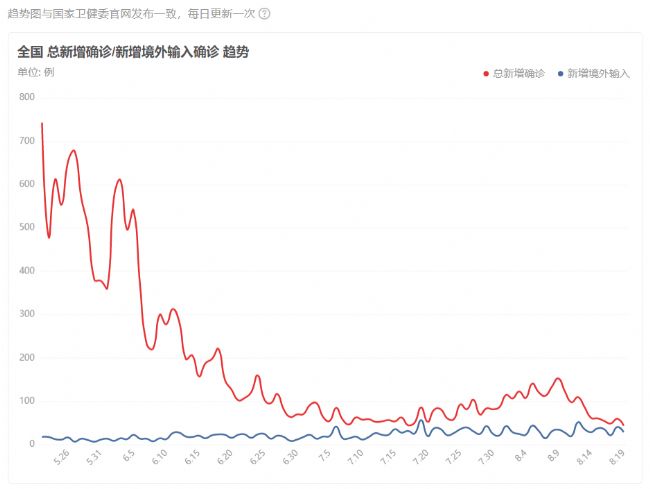 據國家衛健委報道:截至8月19日24時,據31個省(自治區、直轄市)和新疆生產建設兵團報告,現有確診病例1817例(其中重癥病例54例),累計治愈出院病例88126例,累計死亡病例4636例,累計報告確診病例94579例,現有疑似病例4例。累計追蹤到密切接觸者1155346人,尚在醫學觀察的密切接觸者40859人。
