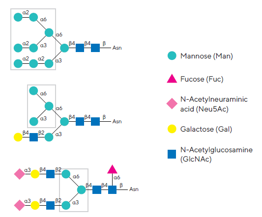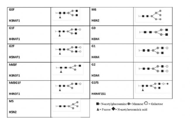 單克隆抗體糖基化修飾多數為 N-連接的聚糖。IgG抗體一般在Fc段的Asn297有一個保守的N糖基化位點。其核心結構是由 3 個甘露糖(Man)和2 個 N-乙酰葡糖胺(GlcNAc)分子組成的復雜“雙觸角型”五糖分子的結構,并且不同的糖型可含有不同數量的其他分子,如巖藻糖(Fuc)、甘露糖、N-乙酰葡糖胺、半乳糖(Gal)、二等分 N-乙酰葡糖胺和唾液酸(Sia)。這些糖鏈的長度、分叉的方式、單糖的排列順序的差異造成了N-聚糖復雜多變的結構。