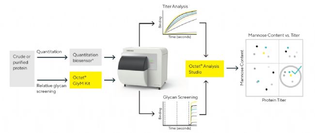 分別用Octet的傳感器檢測蛋白濃度(比如用Octet®蛋白A(ProA)生物傳感器檢測IgG titer),根據濃度把所有樣品都調整在某個濃度下,然后用糖型化檢測試劑盒檢測糖基化水平,并與濃度信息一起分析來選取最佳克隆。