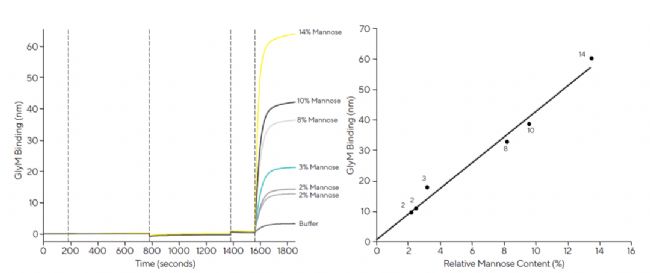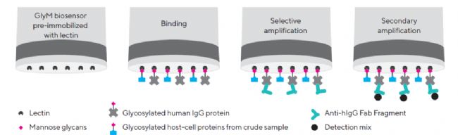 目前,賽多利斯已推出唾液酸(GlyS)檢測試劑盒和甘露糖(GlyM)檢測試劑盒,原理是將能特異性識別某種糖型的凝集素固化在傳感器上,然后與糖基化樣品結合,再通過信號放大的方法對糖基化水平進行排序。