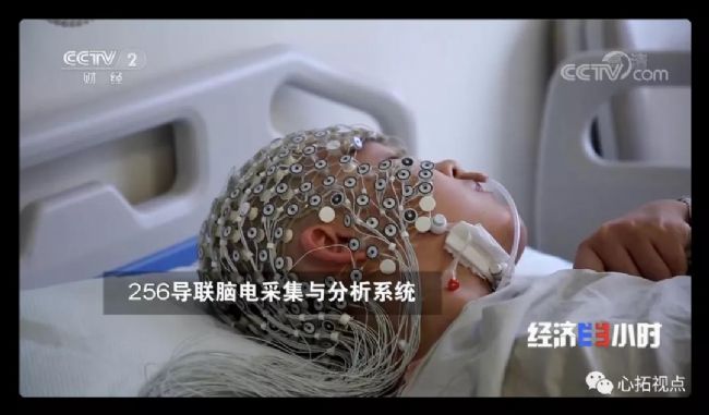 在北京天壇醫院進行意識障礙檢測的“秘密武器”之一——256導聯腦電采集與分析系統。該高密度導聯系統是世界上非常先進的設備,其優點在于高靈敏的檢測和高密度的空間分辨率,傳統的技術手段通常依靠人為的檢測和判斷,不能反映腦活動的情況,現在在意識障礙等神經疾病的檢測上,可以使用該“秘密武器”進行腦活動監測,并進行數據的解碼,了解患者的腦活動水平,進而可以判斷意識障礙的“蘇醒”情況。