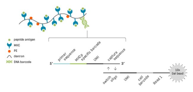 Immudex公司商業化的dCODE Dextramer®即利用這種關系,用糖基骨架與多個MHC -多肽復合物相連。dCODE Dextramer®試劑包括攜帶多個MHC -多肽復合物的糖基骨架和相應的獨特DNA條形碼,獨特的DNA條形碼包括:兼容Illumina®測序儀的引物序列、UMI、識別MHC多肽特異性的ID序列(barcode)、適配于10x Genomics免疫分析解決方案的Capture Sequence,從而實現在單細胞水平上檢測TCR及相應的抗原特異性。更好地理解TCR-抗原的結合關系,對免疫反應進行更全面的探索,將是成功開發細胞和轉基因免疫療法的關鍵,對監測治療干預、鑒定新靶點等提供重要幫助。