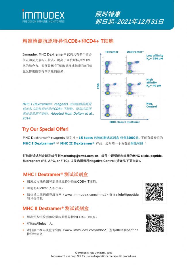 Immudex公司總部位于丹麥哥本哈根,致力于提供高質量的產品和服務。Immudex試劑廣泛應用于生命科學研究、IVD、疫苗開發和免疫療法中抗原特異性T細胞的定量或分選。Dextramer®CMV試劑盒已獲歐洲(CE mark)批準用于IVD (CMV特異性T細胞定量)。2017年3月獲得美國FDA 510(k)許可。