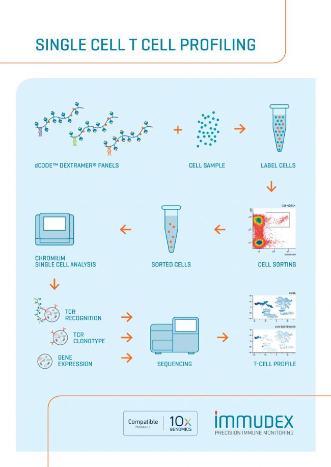 作為10x Genomics的官方合作伙伴,Immudex公司可以提供專利技術的商業化產品dCODE Dextramer®,用獨特的寡核苷酸偶連多個肽段-MHC,結合10x Genomics的Feature Barcoding技術,從而實現單細胞水平的抗原特異性檢測,同時提供T細胞受體克隆型和基因表達的信息,助力10x Genomics實現對免疫細胞進行單細胞分辨率的多重分析。