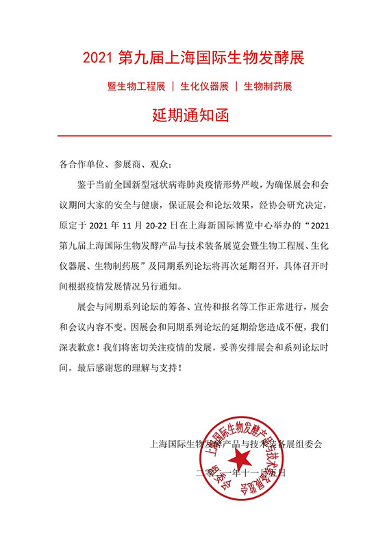 2021第九屆上海國際生物發酵展延期公告