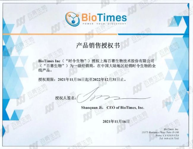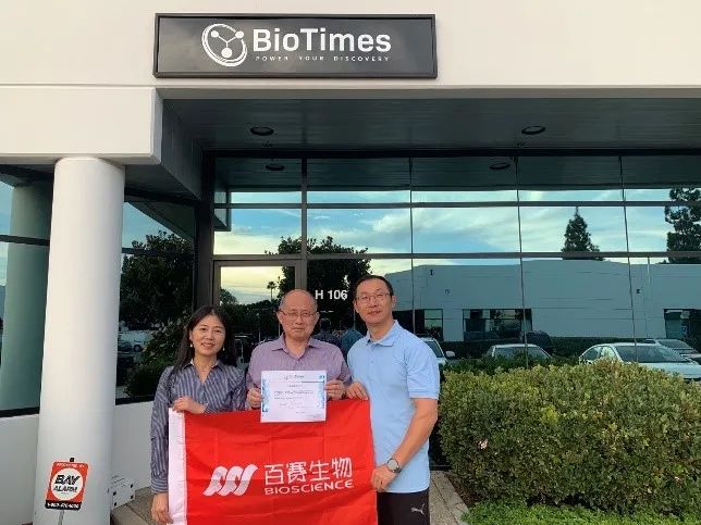 2021年11月16日,百賽生物與美國BioTimes, Inc. (即“時令生物” www.biotimesinc.com)正式簽約,成為時令生物在中國的授權經銷商。百賽生物副總裁王旭梅女士與時令生物首席執行官(CEO)嵇紹權博士、首席科學官(CSO)周婕博士及銷售總監高緒文先生在時令生物美國總部辦公室簽署了戰略合作協議,期望共同為中國生命科學、生物技術、醫學研究和 IVD 多方面的研發領域提供創新、優質的產品和服務。