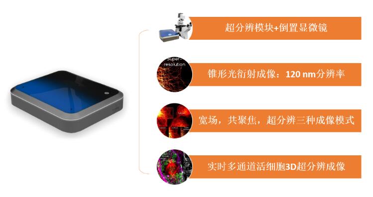 獨有的錐形光衍射成像技術實現活細胞超分辨成像,分辨率高達120 nm,實現x,y,z,時間序列,多通道的5D實時超分辨成像,可以實時觀測諸如細胞器動態變化,小分子轉運,以及細胞分裂等等非常精密的動力學過程。