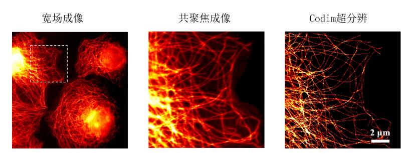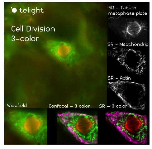 熒光顯微鏡是進行生物學研究的常用工具,但其易受到光學衍射極限的影響,最高的分辨率為200 nm,因此很難觀察細胞中的超微結構。近年來,共聚焦顯微鏡得到了長足的發展,被廣泛應用于生物、醫學等日常科研中。基于此,為更好的助力我國科研人員的研究,近期,Quantum Design中國引進了法國Telight公司的模塊化超高分辨率共聚焦顯微鏡——LiveCodim。該公司具有多年的研發經驗,設計的LiveCodim具備超高的光學分辨率(120 nm)、極低的光毒性、操作簡單以及結果可靠等優勢。且該設備通過獨有的錐形光衍射成像技術實現了實時超高分辨率成像,以結構光掃描成像的方式實現了寬場、共聚焦和超高分辨率成像三合一的模式,為實時活細胞超分辨觀測提供了一個最佳的解決方案。