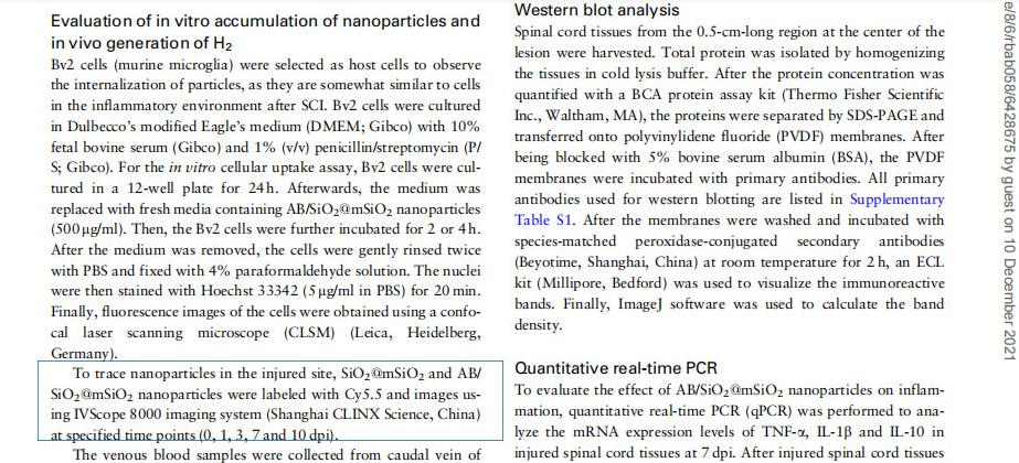 如上圖藍色框線中所述,“為追蹤受傷部位的納米顆粒,采用IVScope 8000成像系統(上海勤翔科學儀器有限公司,中國)在指定時間點(0、1、3、7和10 dpi)拍攝圖像,并用Cy5.5標記了SiO2@mSiO2和AB/SiO2@mSiO2納米顆粒”(注:筆者譯)。