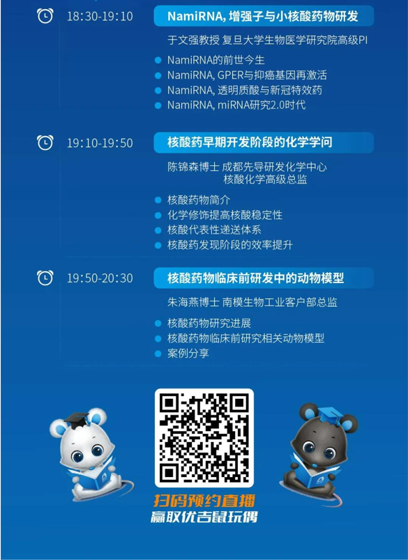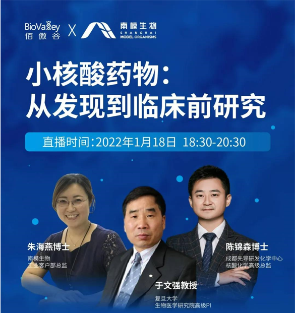 基于此,我們特別邀請了復旦大學生物醫學研究院于文強教授,成都先導研發化學中心高級總監陳錦森博士,與南模生物工業客戶部總監朱海燕博士一道,舉辦一場線上學術沙龍,與大家共同探討小核酸藥物發現及臨床前研究的相關議題。本次線上沙龍將于1月18日下午6:30準時開始,掃描文末二維碼可預約,歡迎大家前來交流討論。