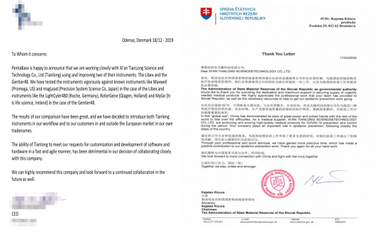 其實早在新冠疫情爆發之前,天隆產品就已遠銷歐洲、北美、大洋洲、東南亞等世界多個地區,裝備海外多個疾控中心、醫療機構、第三方醫學檢驗所等單位,產品廣泛用于傳染病監測、遺傳病診斷、腫瘤診療、個性化用藥等領域。憑借匠心的產品品質,完善的服務體系,天隆海外銷售額連年快速增長,并與世界多個IVD試劑及原料公司達成戰略合作,也陸續收到丹麥客戶及斯洛伐克政府等單位的感謝信。