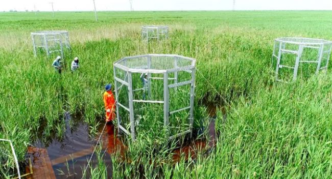 葉思源表示,類似這種裝置,濱海濕地野外站已布設于遼河三角洲、黃河三角洲、鹽城3個濕地,覆蓋了2種植被、3個緯度帶,并與歐美國家同等的增溫站聯網,全球科學家共享數據,合作研究預測不同緯度、不同生境、不同地質演化階段的濱海濕地在未來氣候變暖情況下固碳能力的變化,為應對全球變暖提出科學建議。