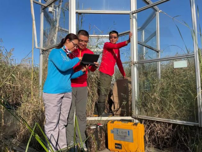 那么,科研人員又是如何監測二氧化碳或甲烷等溫室氣體排放速率的呢?葉思源向觀眾介紹了一個形似黑箱的測量裝置。“我們通過該封閉箱采集氣體,用布罩住形成一個黑箱,連接儀器,可以看到在沒有光合作用的情況下二氧化碳濃度的變化,從而測量濕地生態系統二氧化碳的釋放速率。”
