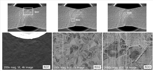 蔡司原位電鏡解決方案可實現自動化原位實驗工作流程,集成化軟件不僅可以自動控制樣品臺應力加載,還可以設定多個感興趣區域(ROI),并對不同ROI進行自動追蹤、自動聚焦、自動獲取圖像。不同ROI的成像參數可以獨立設定,系統還可以識別樣品斷裂狀態并自動終止實驗。