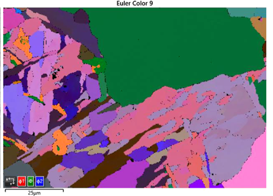 ▲ 800°C下加熱17 小時的鋼鐵樣品自動采集到一系列EBSD圖像,展示了晶界和晶粒取向的變化。