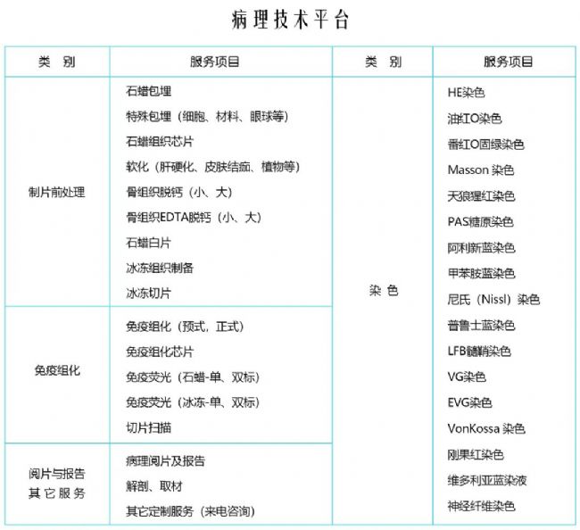 制片前處理:石蠟包埋、石蠟組織芯片、特殊包埋(細胞、材料、眼球等)、軟化(肝硬化、皮膚結(jié)痂、植物等)、骨組織脫鈣、骨組織EDTA脫鈣、冰凍組織制備、石蠟白片、冰凍切片。