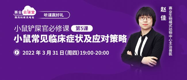 2022年3月31日(周四)晚上七點(diǎn),鎖定賽業(yè)生物直播間,賽業(yè)生物模式動(dòng)物中心主治獸醫(yī)趙佳老師將為你帶來(lái)小鼠常見(jiàn)臨床癥狀及應(yīng)對(duì)策略相關(guān)課程,詳細(xì)講解小鼠日常觀察流程、常見(jiàn)臨床癥狀評(píng)估以及相應(yīng)的防治措施。與此同時(shí),優(yōu)酷VIP會(huì)員月卡等精美禮品也會(huì)在直播間同步放送!愿你攜知識(shí)干貨和驚喜好禮滿載而歸~