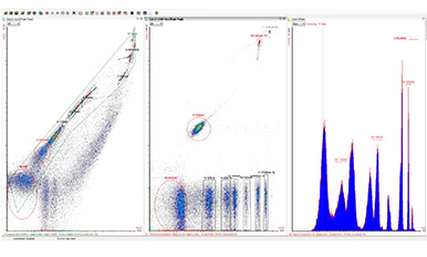 圖1:不同大小標準微球在峰形圖中的分辨率可很好地展現流式細胞儀的分析性能。理想情況下,8種不同大小的標準微球峰形群應相互分離,并可與儀器噪聲明顯區分開:6種大小,折射率為1.43的二氧化硅微球和2種大。110nm和500nm),折射率為1.59的綠色熒光乳膠微球(488nm激光激發)(中間圖)。