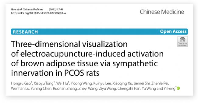 2022年4月18日,國際學術期刊Chinese Medicine在線發表了復旦大學基礎醫學院中西醫結合學系馮異團隊的研究成果“Three-dimensional visualization of electroacupuncture-induced activation of brown adipose tissue via sympathetic innervation in PCOS rats”。