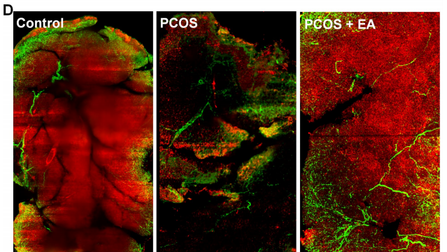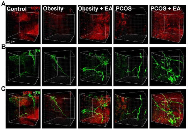 哺乳動物WAT的功能是儲存和釋放能量,而BAT的功能是針對不同的刺激消耗能量和產生熱量。BAT的產熱活性主要依賴于位于線粒體內膜的線粒體棕色脂肪解偶聯蛋1 (UCP1)的功能。臨床實踐中,EA已被證明可改善PCOS患者的肥胖和生殖功能障礙,在PCOS大鼠模型研究中表明EA可以影響WAT。然而,BAT在PCOS和EA治療后的功能和神經調節仍然未知。本研究應用雙氫睪酮 (DHT) 或高脂飲食,分別建立PCOS和肥胖模型,并利用透明化三維成像技術探討BAT在PCOS大鼠模型中的作用及其與EA的關系。