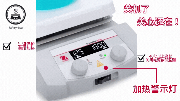 GuardianTM 3000 加熱磁力攪拌器具有出色的長(zhǎng)時(shí)間高速攪拌能力,良好的防溫度過沖能力。但奧豪斯不僅關(guān)注性能,我們一樣重視操作人員的安全和使用體驗(yàn)。我們沿襲Guardian家族的安全設(shè)計(jì)SafetyHeartTM,在設(shè)備超過設(shè)定溫度后及時(shí)關(guān)閉加熱功能;即便關(guān)機(jī)了,醒目的加熱警示燈實(shí)時(shí)監(jiān)測(cè)設(shè)備仍可忠實(shí)呵護(hù)操作者的安全。