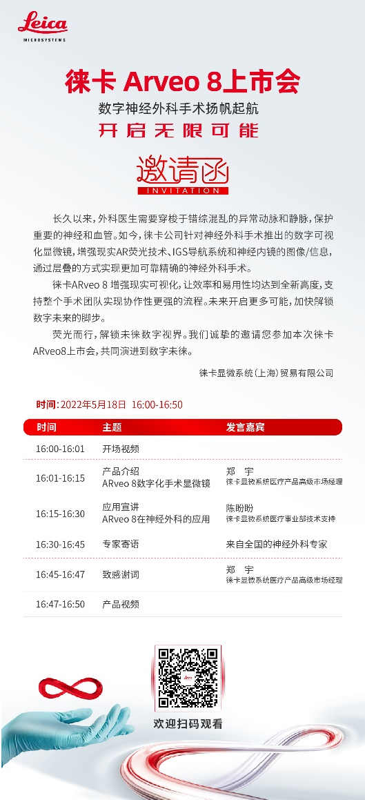 2022年5月18日16:00-17:00徠卡將重磅推出徠卡ARveo 8數字化神經外科手術顯微鏡,我們誠邀您一起相聚在云端,共同見證這一重要時刻。
