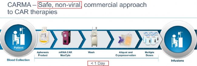 MaxCyte電轉平臺不僅賦能全球的合作伙伴,也讓MaxCyte自己成為了細胞治療研發企業中的后起之秀。利用自家的Flow Electroporation技術建立了CARMA mRNA技術平臺,來用于制造自體細胞療法研發和生產,而公司的第一個細胞治療產品MCY-M11早在2018年已經通過美國FDA批準進入臨床,MCY-M11是一款基于新鮮的、未擴增的、自體外周血單個核細胞(PBMC),并利用編碼人抗間皮素的CAR mRNA對PBMC進行電穿孔轉染的CAR細胞療法,可以實現快速生產(<1天)。
