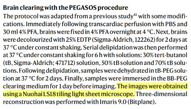 該文中的膠質瘤小鼠模型腦樣本經過組織透明化后,使用锘海LS18平鋪光片顯微鏡進行3D全腦成像。
