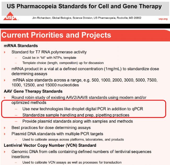 從監管趨勢來看,美國藥典在細胞和基因治療標準品章節中明確寫道,AAV標準品定量將會使用數字PCR進行定量,可見數字PCR方法在細胞和基因治療領域中絕對定量的突出優勢。