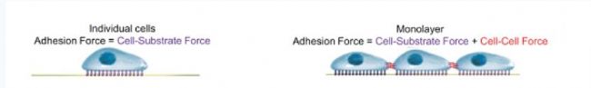 眾所周知,細胞在基質上進行單層培養時,吸附在基質表面時主要會產生兩種不同類型的力,一種是細胞與基質之間的粘附力,另一種是細胞與細胞之間的粘附力。因此對于細胞粘附力來說,單個細胞的粘附力就是細胞與基質之間的作用力。而單層細胞的細胞粘附力則是細胞之間相互作用力和細胞基質與細胞之間作用力之和。如下圖所示:
