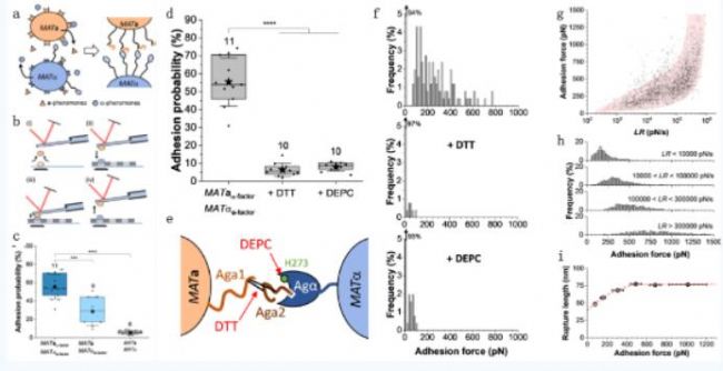 此外,研究組發現凝集素二硫鍵在粘附過程中起到了關鍵作用,而這一作用主要來自于α-凝集素的組氨酸殘基His273。更為有趣的是,作者發現機械張力增強了相互作用的強度,這可能是由于激誘導凝集素構象從弱結合折疊狀態轉換成強綁定伸展狀態導致。這項研究很好地展現了一種理解控制酵母性別的復雜機制的可能方法。