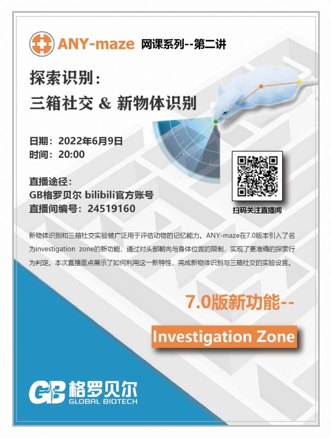 新物體識別和三箱社交實驗被廣泛用于評估動物的記憶能力。ANY-maze在7.0版本引入了名為investigation zone的新功能,通過對頭部朝向與身體位置的限制,實現了更準確的探索行為判定。本次直播重點展示了如何利用這一新特性,完成新物體識別與三箱社交的實驗設置。
