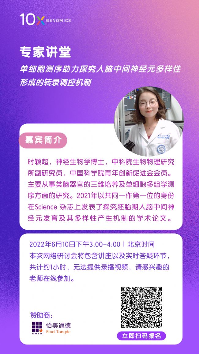 歡迎注冊參加由10x Genomics和怡美通德聯合舉辦的專家講堂:單細胞測序助力探究人腦中間神經元多樣性形成的轉錄調控機制。本次網絡研討會我們非常榮幸地邀請到中科院生物物理所副研究員、神經生物學博士時穎超,2021年時穎超博士以共同一作第一位的身份在Science 雜志上發表了探究胚胎期人腦中間神經元發育及其多樣性產生機制的學術論文。