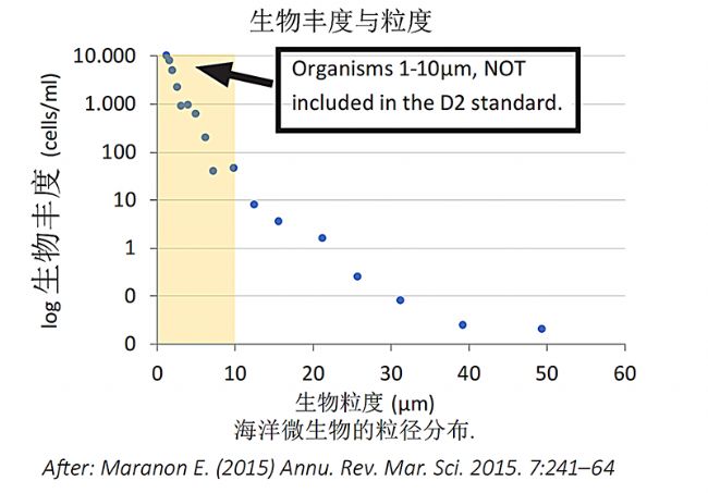 D2標準根據粒徑級來限制存活生物體的數量。海洋微生物的尺寸分布表明,未包含在D2標準中的1-10μm生物數量也很大,這使得粒徑成為一個重要的因素。用BallastWISE壓艙水檢測系統測量與顯微鏡粒徑測量結果非常一致。