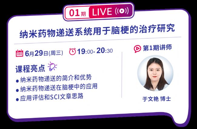 第一期直播邀請到了鄭州大學藥學院于文艷博士,為我們帶來“納米藥物遞送系統用于腦梗的治療研究”主題分享,6月29日(周三)19:00準時開講,敬請期待~