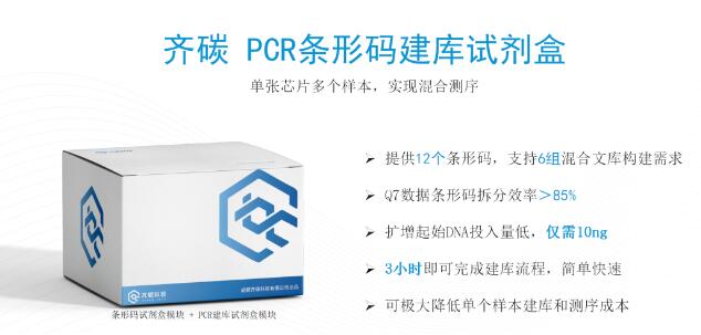發布會上,齊碳科技還帶來一款PCR條形碼建庫試劑盒,滿足單張芯片多個樣本混合測序需求。該試劑盒包含條形碼試劑盒與PCR建庫試劑盒兩個模塊,提供12個條形碼,支持6組混合文庫構建需求,3小時即可完成建庫,簡單快速,配合齊碳QNome測序平臺,可極大降低單個樣本的測序成本。