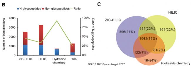 (①HILIC和ZIC-HILIC得到的N -糖肽數量相當(分別為1118和1138);但ZIC-HILIC的富集特異性 (46%)高于HILIC(34%)②在四種富集技術中,酰肼化學富集特異性最高(93%),但鑒定出的N-糖肽數量相對較少(667),在TiO2色譜中,特異性富集含有唾液酸的糖肽,富集得到318個唾液糖肽,特異性僅為26%)
