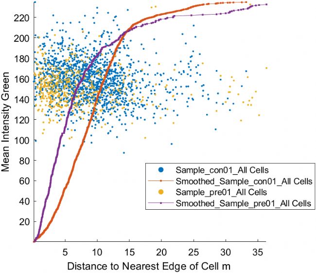在這一期的課程里,我們將以熒光強度vs目標物間的空間距離統計為例,介紹串聯“AI信號識別(pixel classifier)→強度/距離計算→AI分類(object classifier)→批處理→結果對比→驗證假設”等多種功能的數據分析過程。
