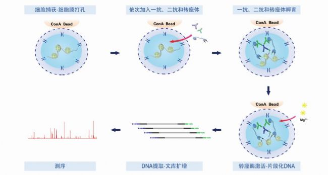 首先ConA beads(Concanavalin A-coated magnetic beads)與細胞膜或核膜相結合,隨后通過穿孔劑對細胞進行穿孔處理,改變其通透性,依次加入和靶蛋白相對應的一抗、二抗和pA-Tn5 Transposase進行孵育,再通過Mg2+激活Tn5酶,Tn5酶在激活的狀態下會定向切割靶蛋白對應的DNA片段,同時在切割的DNA兩端加上文庫擴增的序列接頭,以便于直接對回收的DNA片段進行PCR建庫。隨后文庫質量檢測合格后,便可直接上機測序。