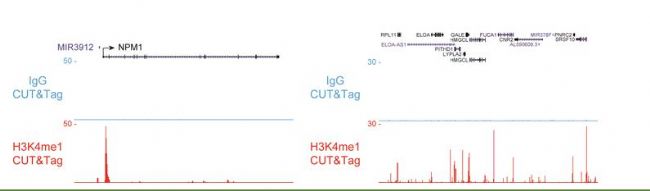 H3K4me1抗體的CUT&Tag數據顯示,與IgG對照組相比,H3K4me1 CUT&Tag檢測到了H3K4me1的信號峰,且信噪比較高。