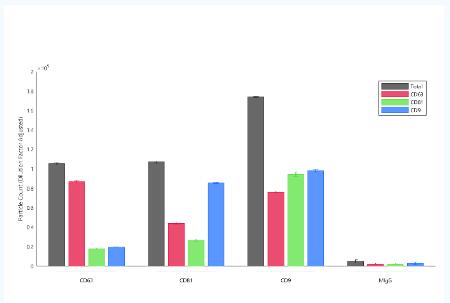 2022年,阮教授在Journal of Extracellular Vesicle發表了題為“Light-induced high-efficient cellular production of immune functional extracellular vesicles”的研究文章,該研究團隊開發了一種簡單直接的方法,通過利用近紫外LED燈(365nm)的光感應來促進樹突狀細胞分泌外泌體 (DEV)。體外和體內實驗的結果顯示,近紫外波長不會損害細胞生長,使DEV生產率提高了13倍以上,同時讓DEV保持了良好的生物相容性和高度免疫性,使其成為理想的治療平臺。在該研究中,研究人員使用ExoView對DEV的免疫性標記物進行檢測,證明光誘導對DEV的免疫標記表達幾乎沒有影響,保證了DEV的高度免疫性。