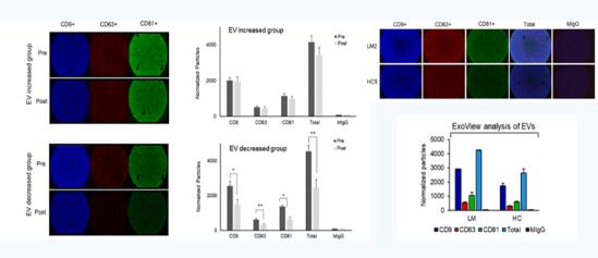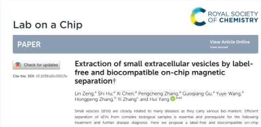 2022年,曾博士在Lab on a Chip發表了題為“Extraction of small extracellular vesicles by labelfree and biocompatible on-chip magnetic separation”的研究文章,該研究團隊基于負磁泳原理構建了一個片上無標記磁分離系統,很好地解決了分離納米生物物質所需的尺寸分辨率要求高和磁性工作溶液生物相容性較低這一矛盾問題。通過使用超低濃度的磁流體即可實現外泌體的高純度和高回收率分選,很大程度上提高了工作溶液的生物相容性,保持了外泌體的長期生物活性。在該研究中,ExoView全自動外泌體熒光檢測分析系統對提取的外泌體進行了全面的表征,如蛋白共定位分析及多色熒光成像等。