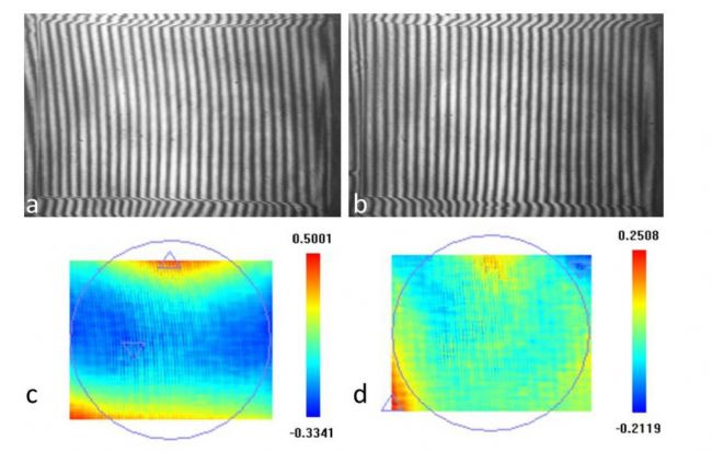 圖4(a/c)未校準的SLM波前(λ/ 7 RMS)(b/d)校準后的SLM波前(λ/ 20 RMS)