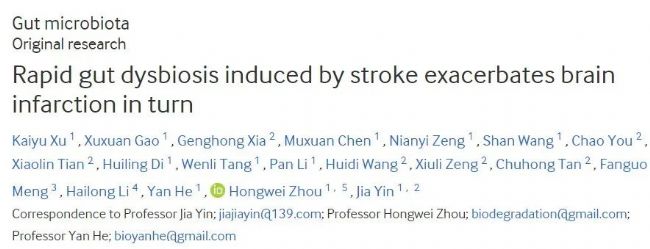 2021年2月,南方醫科大學珠江醫院尹恝、周宏偉、何彥研究團隊在知名期刊《Gut》(2021 IF=23.059)發表了《Rapid gut dysbiosis induced by stroke exacerbates brain infarction in turn》一文。
