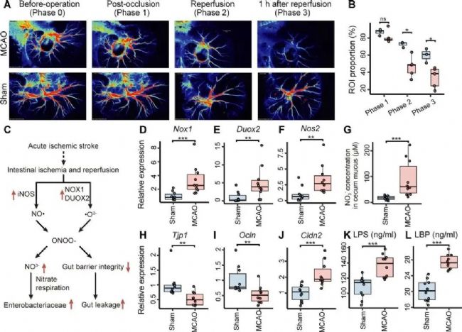 團隊成員發現腦缺血迅速引起腸道缺血,并通過自由基反應產生過量硝酸鹽,導致腸道菌群擴張失調。腸桿菌科富集通過增強全身炎癥而加重腦梗死,是卒中患者主要不良預后的獨立危險因素。使用氨基胍或超氧化物歧化酶減少硝酸鹽生成或使用鎢酸鈉抑制硝酸鹽呼吸均可抑制腸桿菌過度生長,減少全身炎癥并減輕腦梗死。這些影響是腸道菌群依賴的,表明腦腸軸在中風治療中的轉化價值。這項研究揭示了中風和腸道失調之間的相互關系。缺血性中風會迅速引發腸道菌群失調,腸桿菌過度生長,進而加重腦梗死。