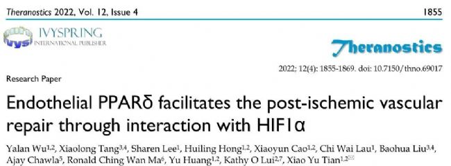 2022年3月,香港中文大學的研究者們在《Theranostics》(2021 IF=11.556)雜志上發表了“Endothelial PPARδ facilitates the post-ischemic vascular repair through interaction with HIF1α”的文章,該研究揭示了低氧誘導的內皮細胞PPARδ非依賴于配體的激活穩定了HIF1α,并且是HIF1α激活的關鍵調節因子,以促進缺血后血管內穩態的恢復。