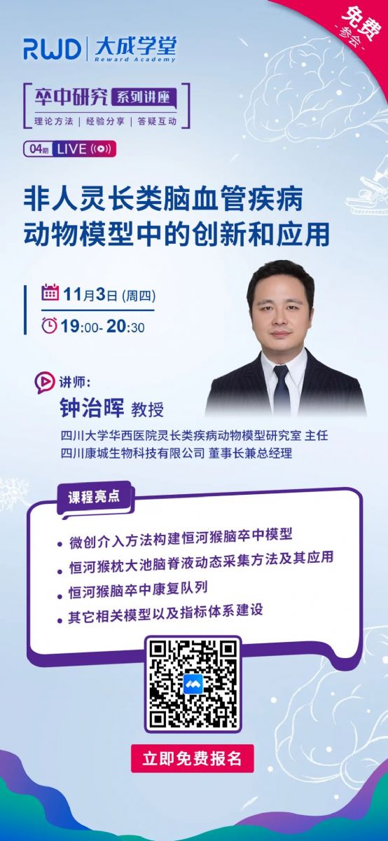 2022年11月3日(周四)19:00,“大成學(xué)堂|卒中研究系列講座”第四期特邀四川大學(xué)華西醫(yī)院靈長(zhǎng)類疾病動(dòng)物模型研究室主任鐘治暉教授,和大家分享非人靈長(zhǎng)類腦血管疾病動(dòng)物模型中的創(chuàng)新和應(yīng)用,為大家的卒中研究、藥物研發(fā)提供新思路新方向。