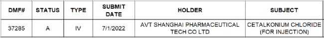 AVT帶來輔料新資訊!艾偉拓給大家供應的注射級輔料-西他氯銨,已完成FDA的DMF備案!