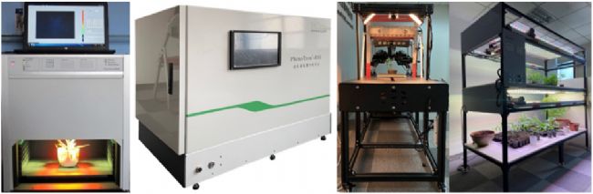 自左至右依次為:FluorCam葉綠素?zé)晒獬上裣到y(tǒng)、PhenoTron-HSI多功能高光譜成像系統(tǒng)、PhenoTron-PTS植物表型分析平臺、PhenoTron復(fù)式作物種質(zhì)資源表型分析平臺(智能LED光源與表型成像分析)