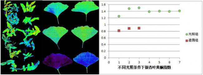 PhenoTron-HSI多功能高光譜成像分析系統(tǒng)實(shí)驗(yàn)。左圖:鐵皮石斛高光譜成像分析(與四川中醫(yī)藥大學(xué)合作項(xiàng)目,尚未發(fā)表禁止引用);中圖及右圖:銀杏葉高光譜葉綠素?zé)晒獬上穹治觯瑘D示為根據(jù)多激發(fā)光激發(fā)葉綠素?zé)晒獬上竦贸龅你y杏葉黃酮含量分布情況,結(jié)果顯示,光照組銀杏葉黃酮含量顯著高于遮蔭狀態(tài)下的銀杏葉(易科泰光譜成像實(shí)驗(yàn)室提供)